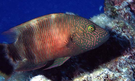 The humphead wrasse is the largest living member of the family Labridae. Males are typically larger than females and are capable of reaching lengths of up to 2 meters from tip to tail. Females rarely grow larger than one meter in length. This species of fish can be easily identified by its large size, thick lips, two black lines behind its eyes and the hump that appears on the forehead of larger adults.